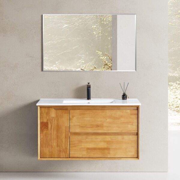 - السعر يشمل : خزانة، حوض من خشب البلوط/سيراميك أبيض لامع مع فتحة صنبور، ومرآة عائمة فقط