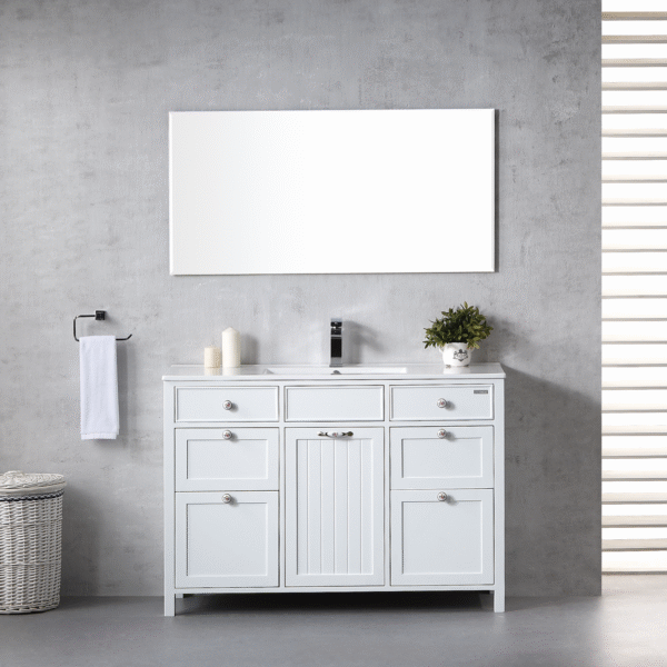 - السعر يشمل : خزانة، حوض من خشب البلوط/سيراميك أبيض لامع مع فتحة صنبور، ومرآة عائمة فقط