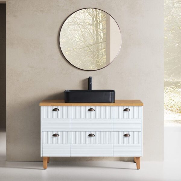 • السعر يشمل : خزانة، حوض من خشب البلوط/سيراميك أبيض لامع مع فتحة صنبور، ومرآة عائمة فقط