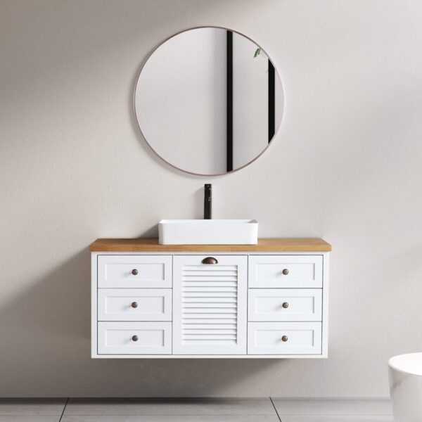 - السعر يشمل : خزانة، حوض من خشب البلوط/سيراميك أبيض لامع مع فتحة صنبور، ومرآة عائمة فقط