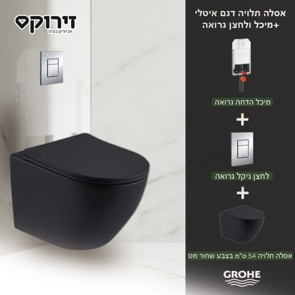 تتضمن مجموعة المراحيض المعلقة على الحائط على الطراز الإيطالي + خزان وصنبور GROHE ما يلي: