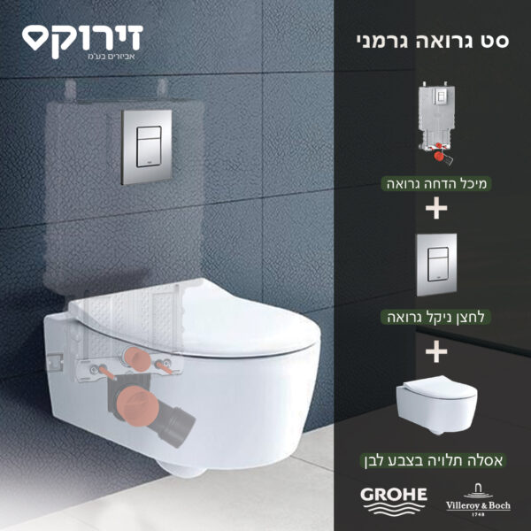 חבילה של סט גרואה גרמני | אסלה תלויה אווינטו villeroy & boch + מיכל הדחה ולחצן GROHE