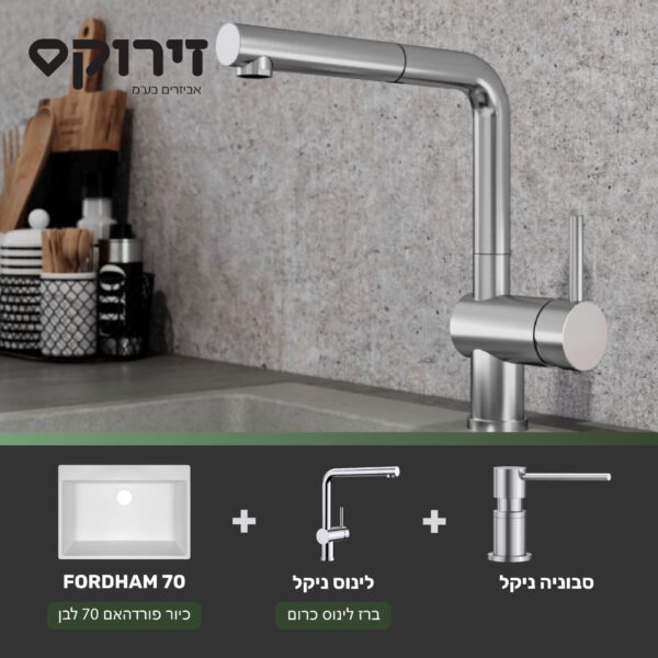 חבילת של סט בלנקו ופורדהאם | כיור פורדהאם 70\50 ס״מ לבן + סבוניה לאטו ניקל + ברז לינוס ניקל